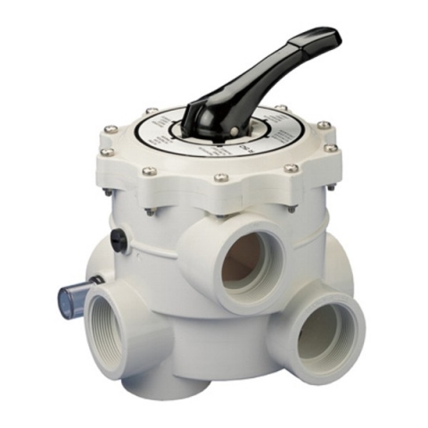 Filterumschaltventil aus Kunststoff, Stellungen: Filtern, Rückspülen, Filter-Kanalisation, Klarspülen, Geschlossen und Zirkulation