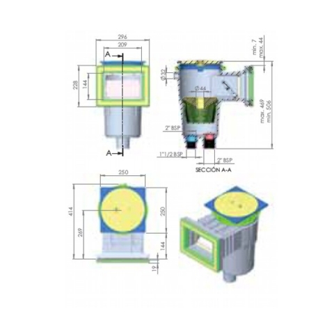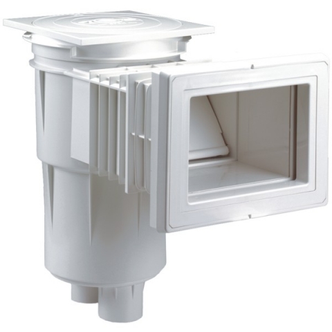 Einbauskimmer ABS für Folienbecken inkl.Bodenreinigeranschlussplatte und höhenverstellbaren quadratischem Deckel , mit Fliesenrahmen, Anschlüsse R11/2" bzw. 2" Innengewinde, Überlauf Durchmesser 32mm, Gewindeeinsätze aus Messing komplett mit Dichtungen und Schrauben, extra große Saugöffnung empfohlene Leistung: max. 10qm/h