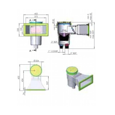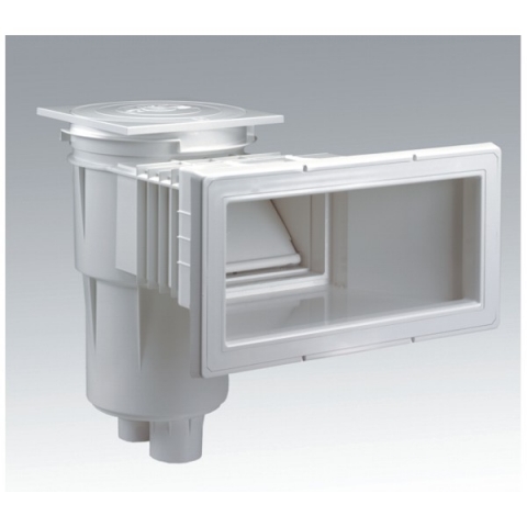 Einbauskimmer ABS für Folienbecken inkl.Bodenreinigeranschlussplatte und höhenverstellbaren quadratischem Deckel , mit Fliesenrahmen, Anschlüsse R11/2" bzw. 2" Innengewinde, Überlauf Durchmesser 32mm, Gewindeeinsätze aus Messing komplett mit Dichtungen und Schrauben, extra große Saugöffnung empfohlene Leistung: max. 10qm/h