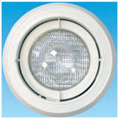 Ausführung mit weißer, runder Abdeckblende, mit Einbaunische und Messing-Quetschverschraubung. Lampe PAR 56, 12 Volt, 300 Watt mit integriertem Reflektor.